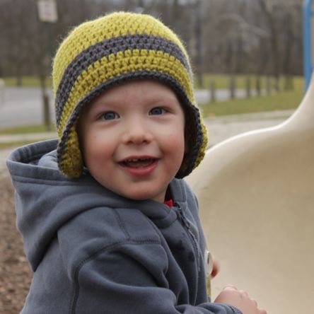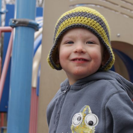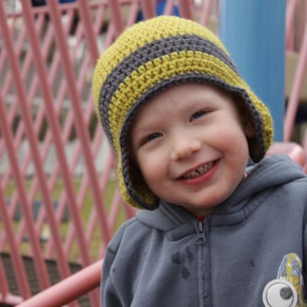 The colors for this hat were inspired from L’s favorite googly-eyed lizard hoodie. I used Vanna’s Choice in Pea Green (color A) for the main hat and Charcoal (Color B) for the stripe. I will just refer to color A and color B from here on out so that you can substitute whatever colors you like. Now L. is only two and a half, but he is a big guy so I always make him child size hats. Here is what I did: