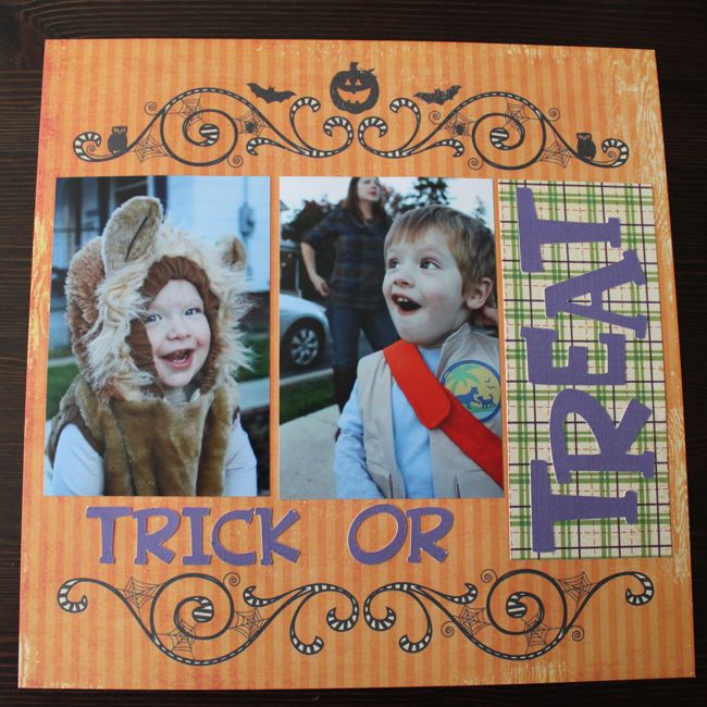 This past weekend I had the opportunity to join a group from my church in an all day scrapbooking event. It was so nice to get away for the day and really focus on finishing some pages. Those are my little guys in their Halloween costumes last year–Go Diego Go and Baby Jaguar (but actually a lion costume from a friend).